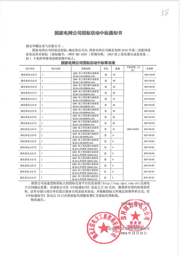 恭喜人生就是博在2016年第二次国家电网配网工程中标台套变压器项目,共计1838.72万